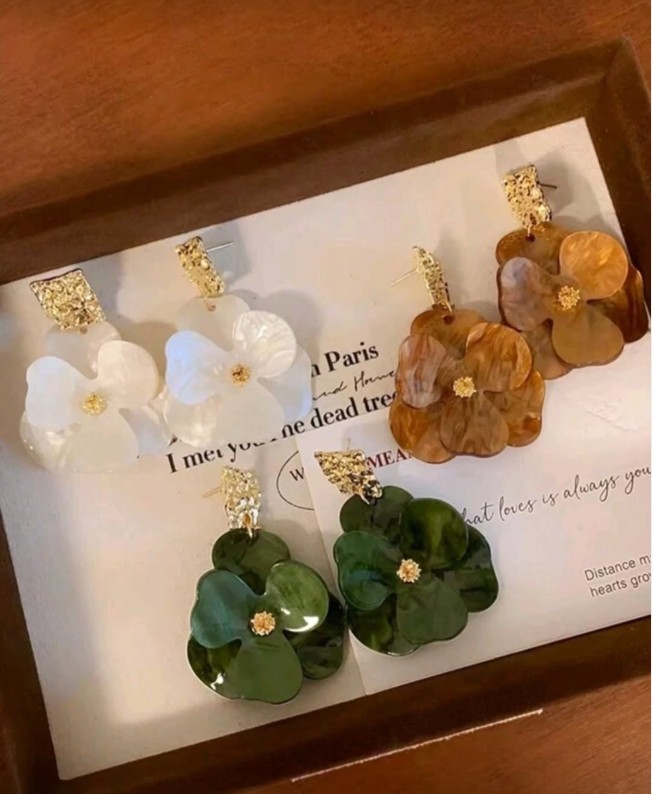 Este brinco é confeccionado em material resinizado com efeito perolado e translúcido nas pétalas, combinado a detalhes dourados que agregam charme ao produto. O formato de flor com pétalas largas oferece uma presença marcante sem pesar no visual.