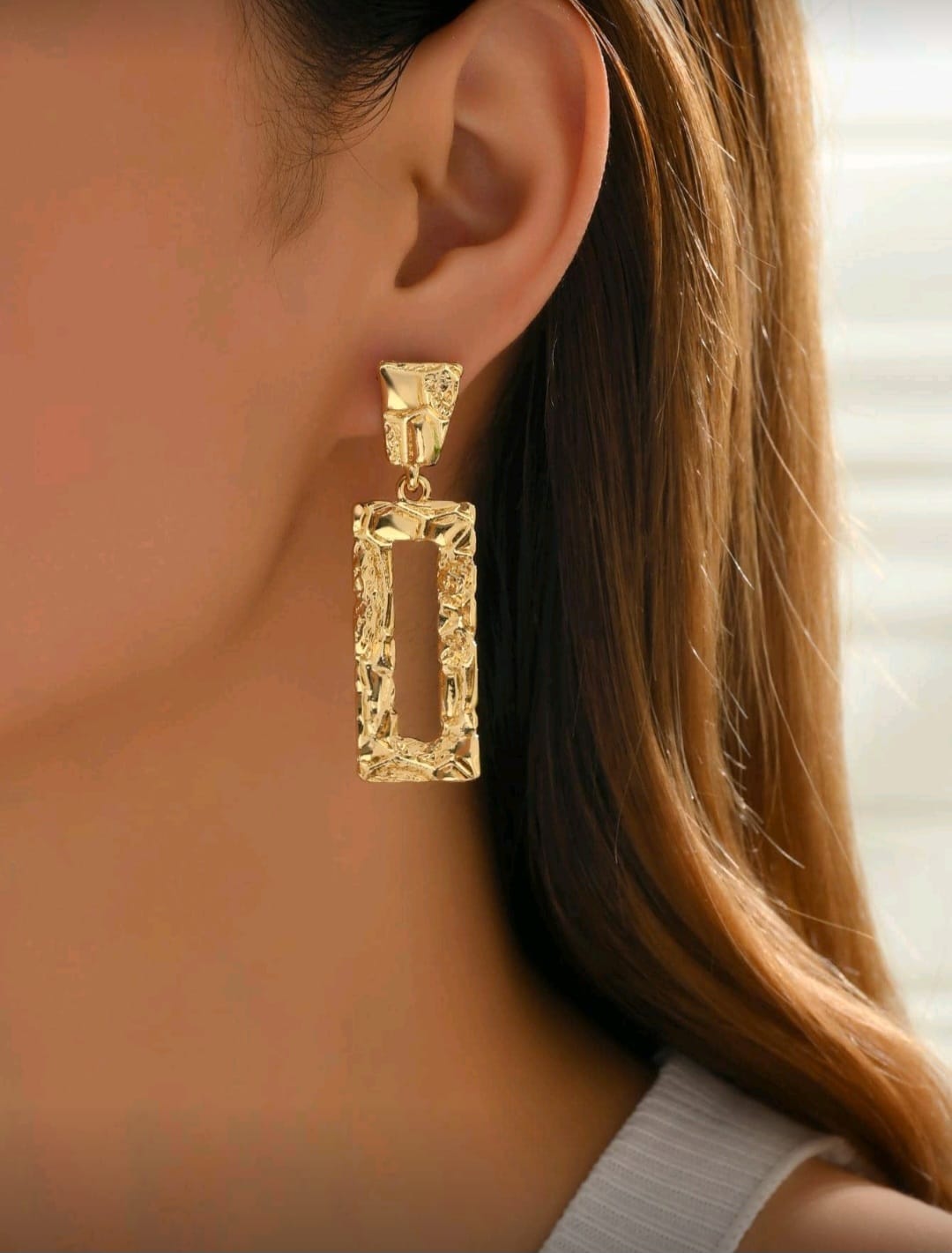 O brinco geométrico dourado da Pk Acessórios é a escolha ideal para quem ama acessórios marcantes e sofisticados. Com formato retangular vazado e acabamento texturizado, a peça traz um visual moderno e elegante que valoriza o rosto e transforma qualquer produção.