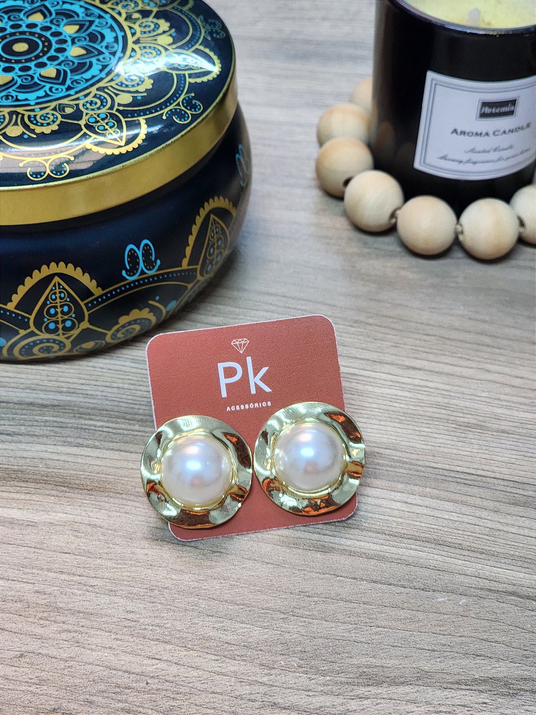 Brinco Redondo de perola com detalhes dourados.