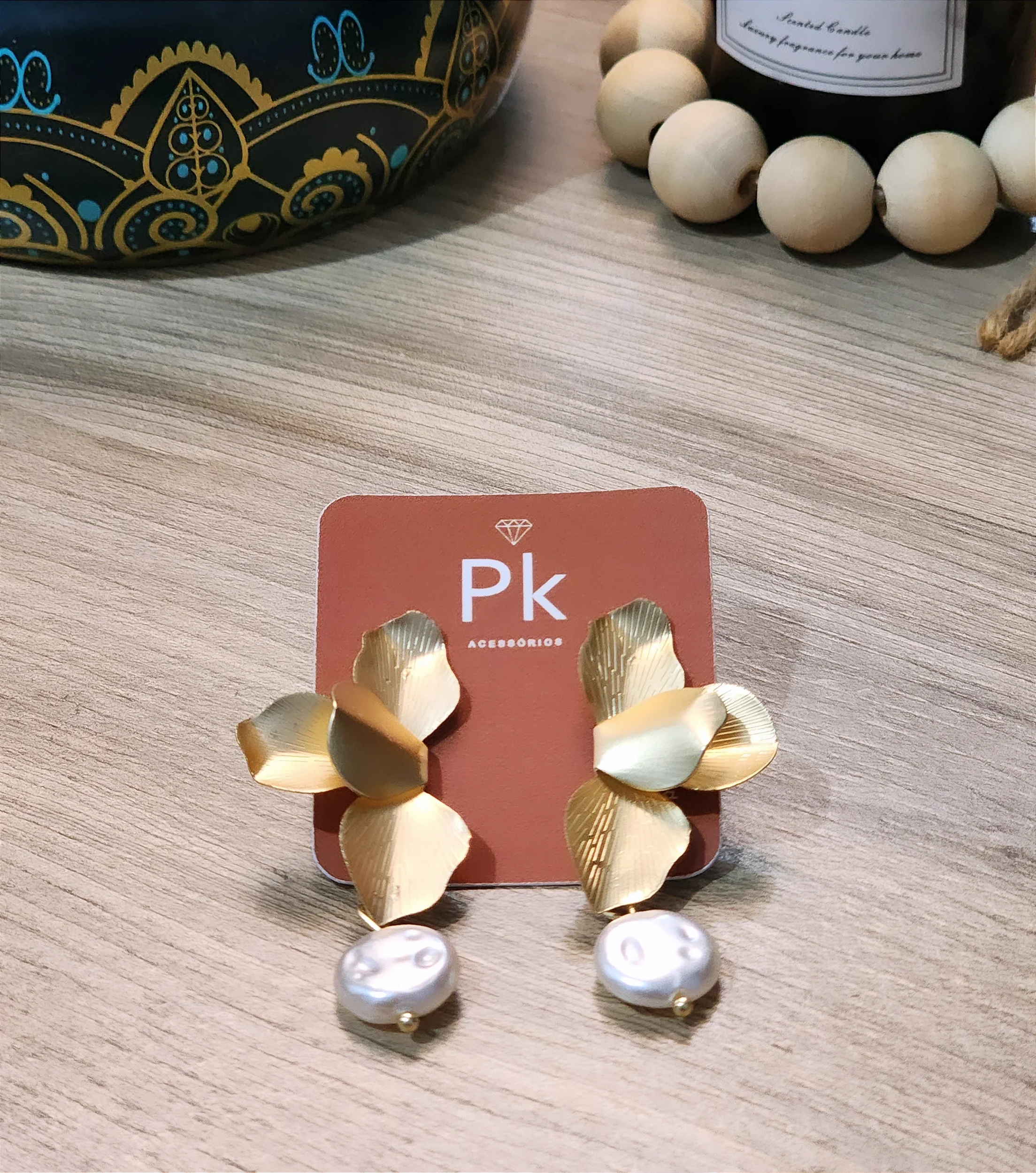 Brinco com pétalas douradas e pérola barroca. Uma peça marcante, inspirada na delicadeza da natureza, perfeita para elevar produções do dia a dia ou complementar looks especiais.
