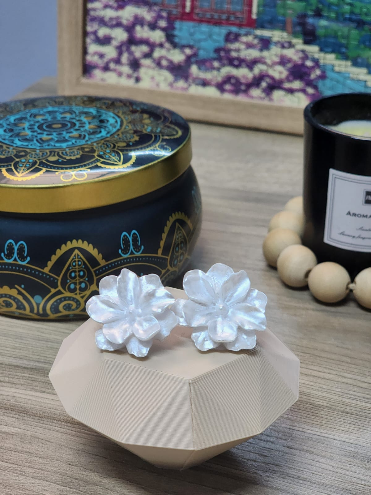 Este brinco apresenta um acabamento com aspecto perolado que imita a textura das flores naturais. É ideal para complementar looks com sutileza e charme. O tamanho é adequado para quem gosta de acessórios discretos que fazem a diferença.